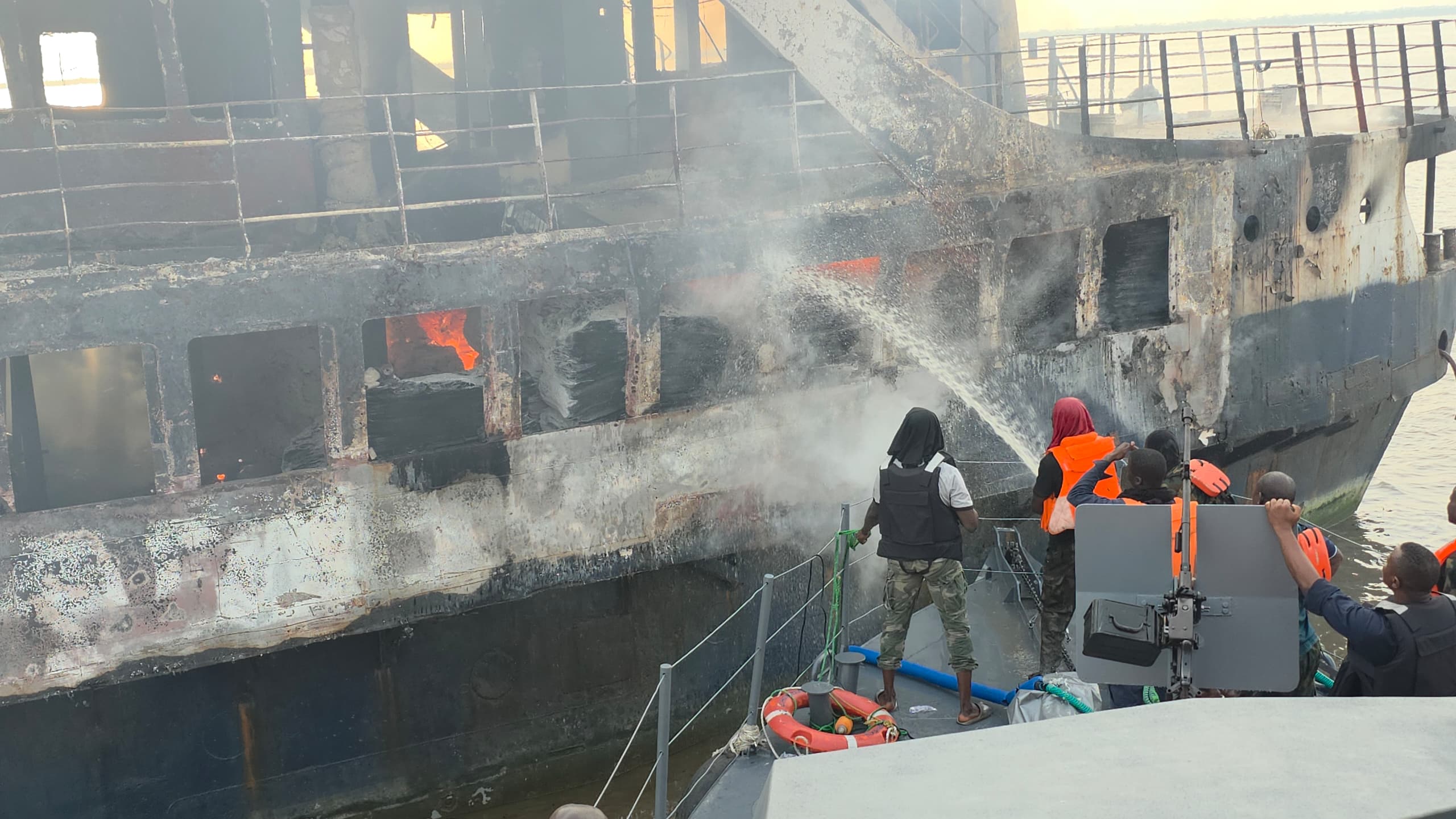 Personnel from Forward Operating Base IBAKA, Naval Security Station 030 Houseboat, and local fishermen supported the operation. NNS OSE also deployed portable pumps to combat the fire, which affected the midship and aft sections of the vessel.