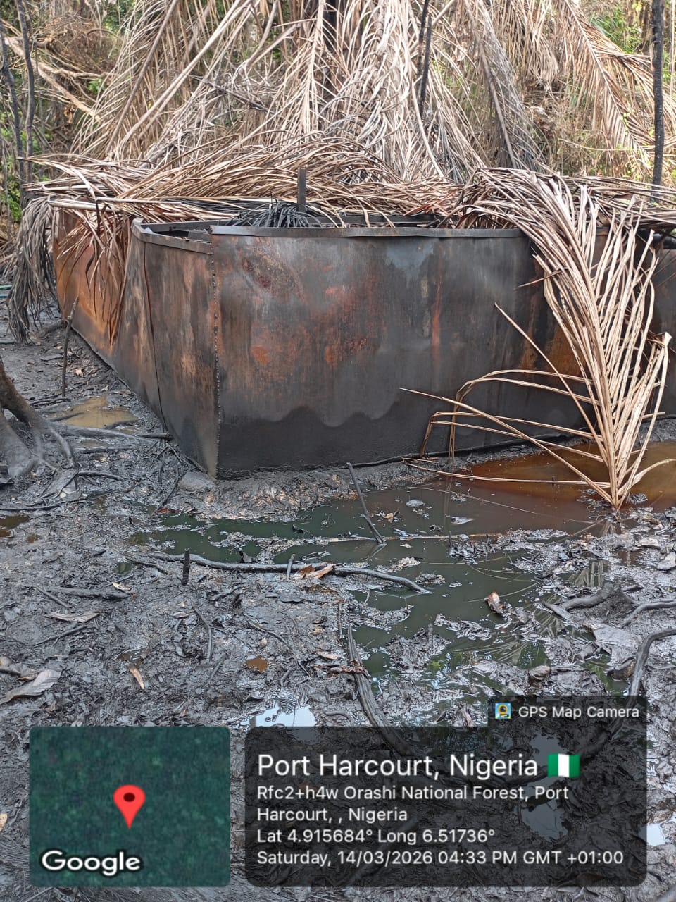 The Nigerian Navy scored another operational success on Saturday, 14 March 2026, with the destruction of a reactivated illegal refinery site in Okolomade Community, Abua-Odual LGA, Rivers State.